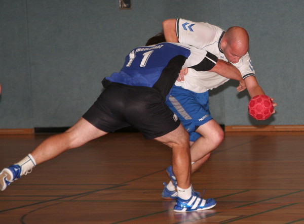 10 Tore weniger als in der 1. Halbzeit kassierte die TSVV-Abwehr. Großen Anteil hatte dabei Martin Rüben. Hier verhindert er mit Hansi Denker (4) ein weiteres Gegentor (Foto:jwg).